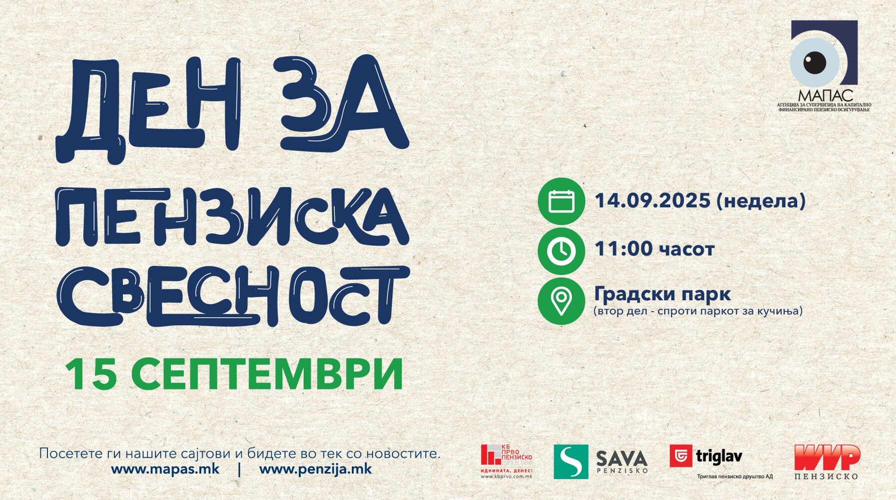 Во рамки на одбележувањето на Денот за пензиска свесност – 15 септември, Агенцијата за супервизија на капитално финансирано пензиско осигурување МАПАС, на 14 септември (недела) од 11:00 до 13:30 часот, во вториот дел на Градски парк (спроти паркот за кучиња), ќе одржи настан на кој сите граѓани ќе имаат можност да се информираат за своите права во пензискиот систем, како и да се забавуваат и да освојат награди.