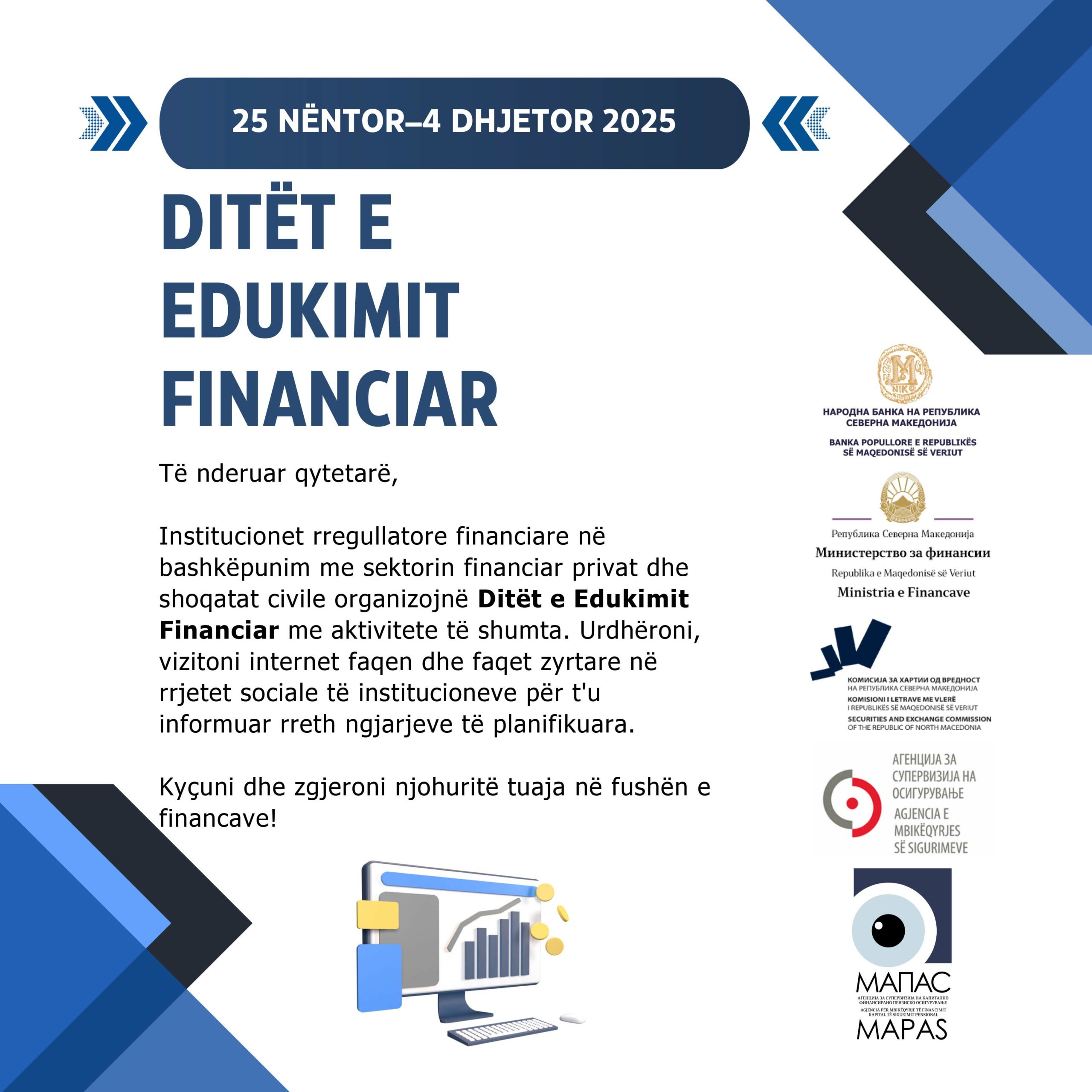 Shënimi i Ditëve të edukimit financiar zhvillohet për të nëntin vit me radhë, në organizim të institucioneve rregullatore financiare: Bankës Popullore, Ministrisë së Financave, Komisionit për Letrat me Vlerë, Agjencisë për mbikëqyrje të financimit kapital të sigurimit pensional – MAPAS dhe Agjencisë për Mbikëqyrjen e Sigurimeve, në bashkëpunim me sektorin financiar privat dhe shoqatat qytetare.